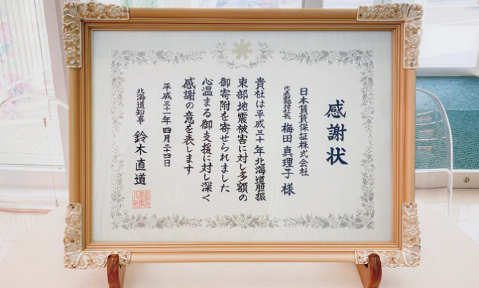 平成30年北海道胆振東部地震の復興支援のため北海道庁を訪問し、被災地支援として1,000万円を義援金として寄付しました。この活動を評価され、北海道庁より感謝状を拝受しました。