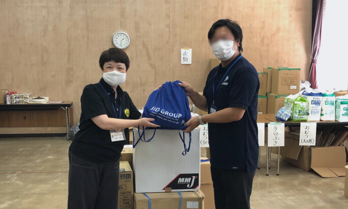 令和2年7月豪雨にて甚大な被害にみまわれた、大分県由布市と福岡県大牟田市の市役所と9名の保証者の方にJID GROUP各社のオリジナルグッズ(日用品)を支援物資としてお届けしました。