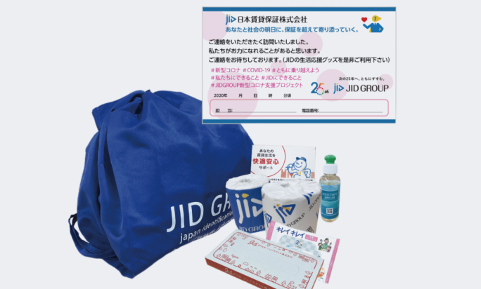 新型コロナウイルスの影響を受けたご契約者さまを対象に、JID GROUP各社で製作したオリジナル生活応援グッズ(トイレットペーパーや除菌シート等)をJIDからのメッセージカードと合わせて配布いたしました。