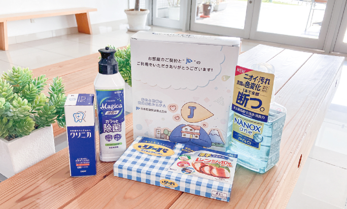 入居が決まったJIDご契約者さまや、家賃の支払いに不安を感じている入居者さまへのコンサルティング時に、生活支援としてノベルティBOXをお渡ししています。歯磨き粉や食器用洗剤、洗濯用洗剤など、生活に欠かせない日用品のセットです。
