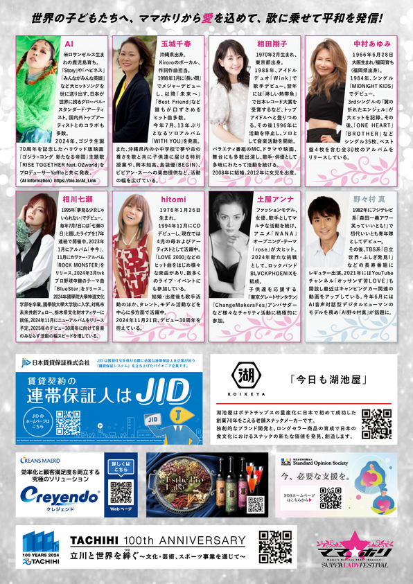 JID GROUPは、日本賃貸保証株式会社(以下「JID」)の社歌「君が光になるとき」を歌う"中村 あゆみ様"がオーガナイザーを務める「ママ★ホリ2024 ーSeason 4ー 」に特別協賛いたします。