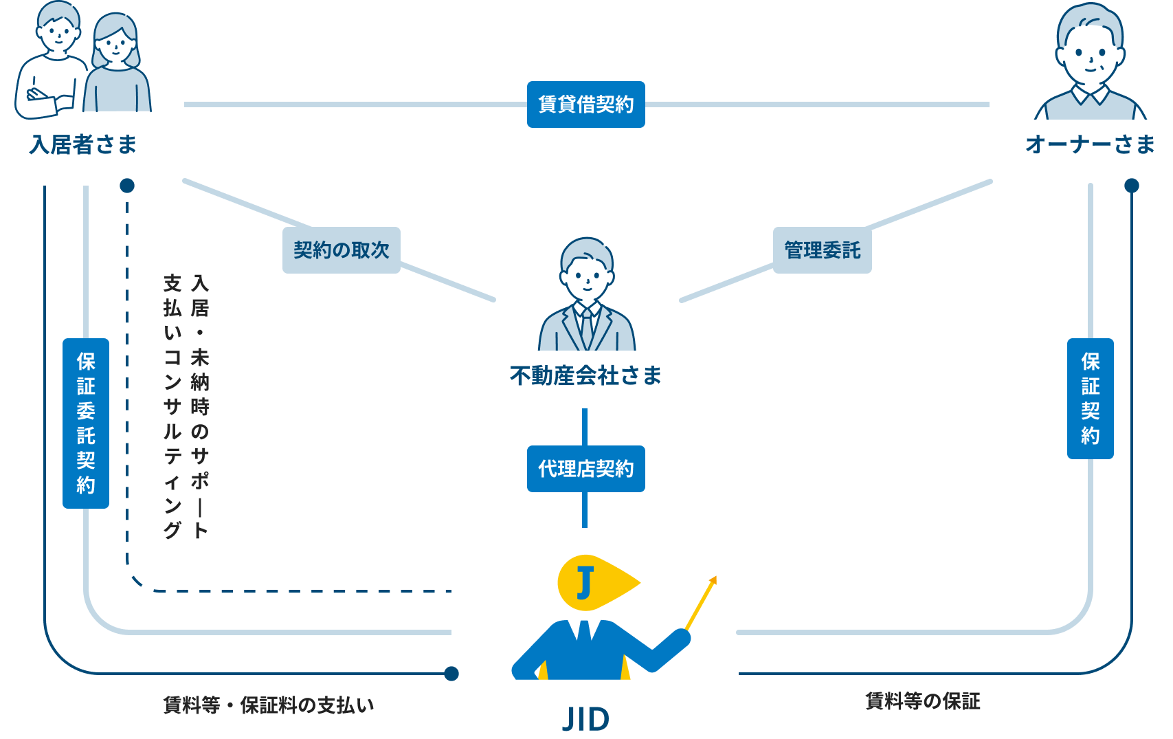 JIDの賃貸保証は連帯保証人を専門機関が代行し、家賃最大24か月立替などで高い信用力を発揮。オーナーさまは多様な入居者さまを安心して迎えられ、入居者さまは保証人探し不要で職業・年齢・国籍を問わずスムーズに入居可能。物件価値と稼働率向上、安定経営に寄与します。